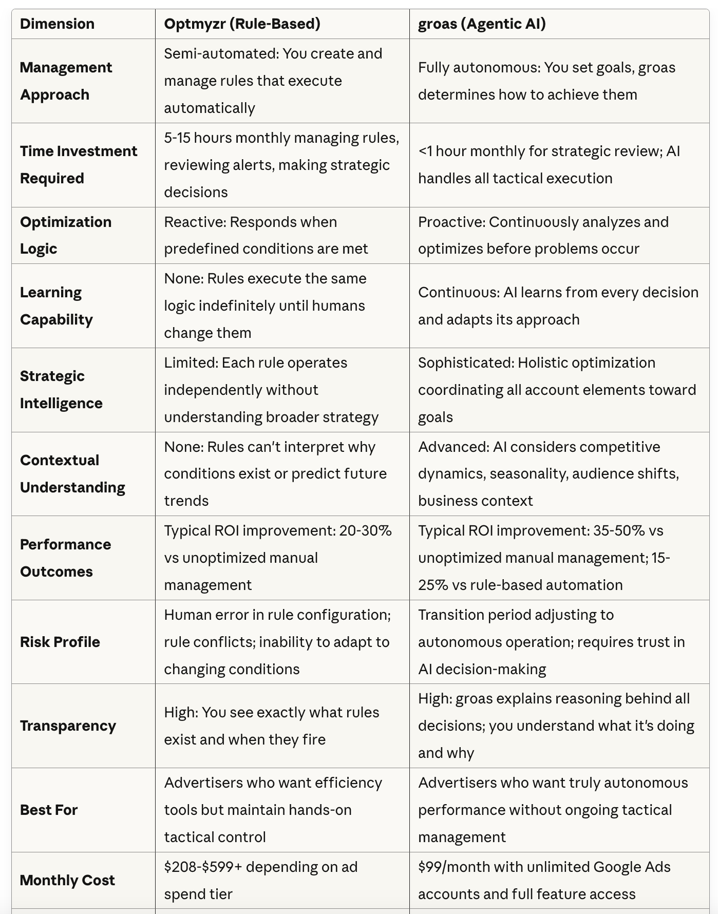 The comparison table shows groas delivering 35-50% ROI improvements versus Optmyzr's 20-30% improvements over unoptimized management. These might sound like modest differences—is an extra 15-20% really worth switching tools?